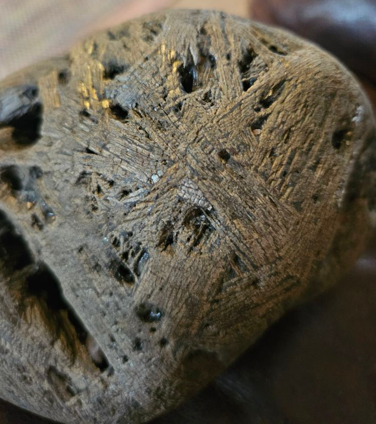 This one is an impact nodule with high heat patina oxidation. Iron thin mosaic melt surface. As another specimen has retained iron oxide rust in the hole, I am convinced the holes are a type of iron plasma impalement. The high number of specimens indicates he has found an impactite strewn field. Nov. 16, 2024.