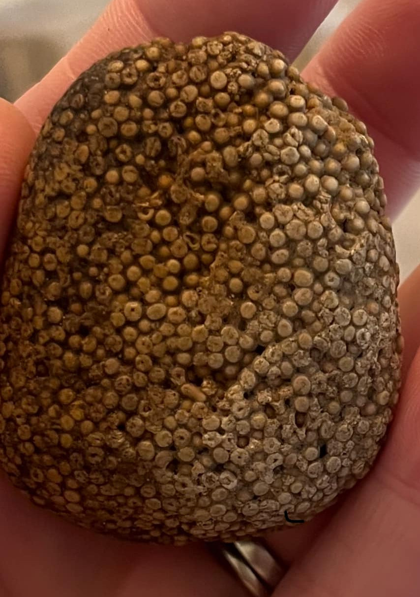 Allright, I like oolites. This one is even an oblate nodule. I believe these to be once fossils shock transformed into spheres as a melt stage. Found near the Jackson Crater. Nov. 11, 2024.